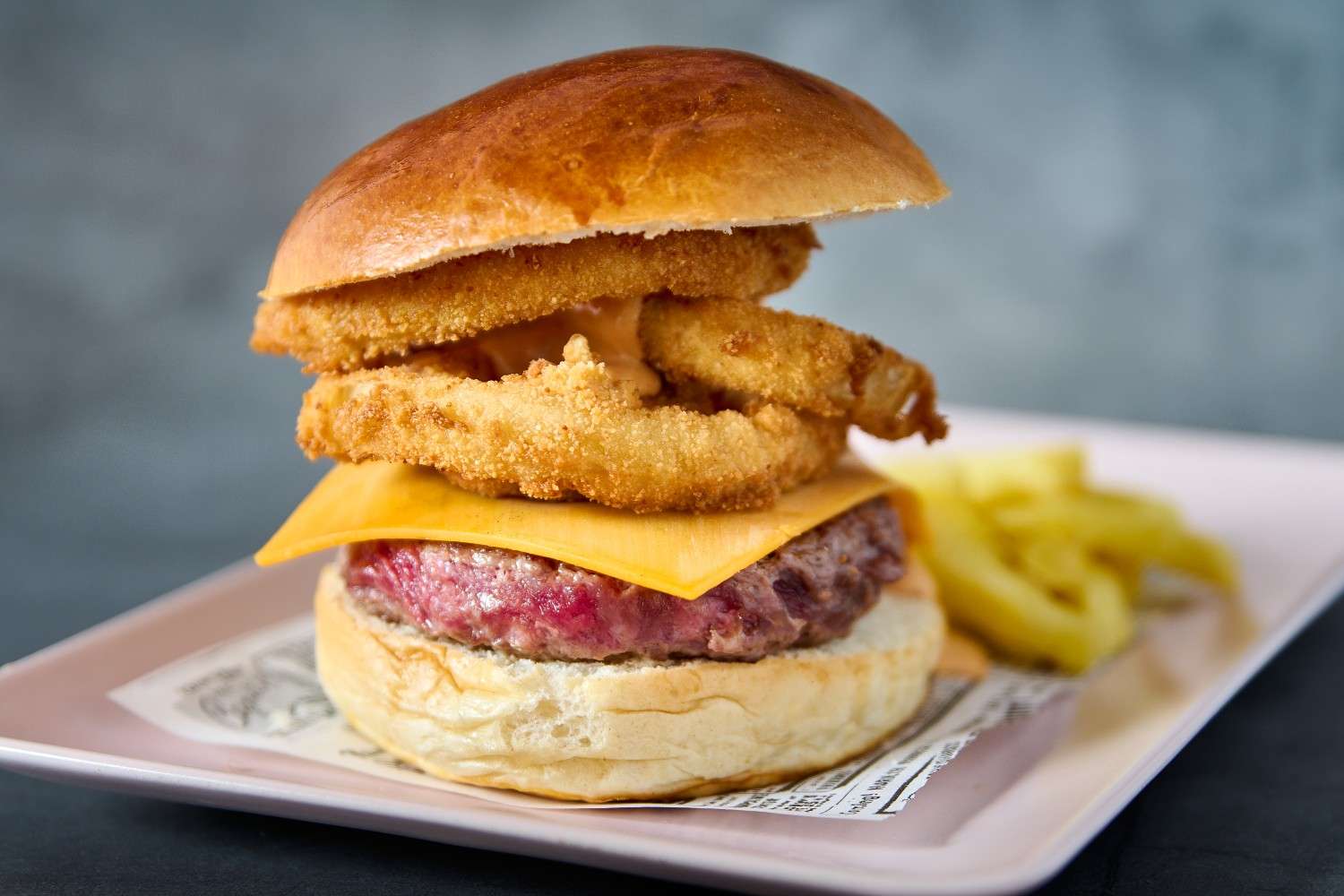 Two Beef patties (fresh never frozen) cooked with cheese, and fried onions on a toasted pub roll.