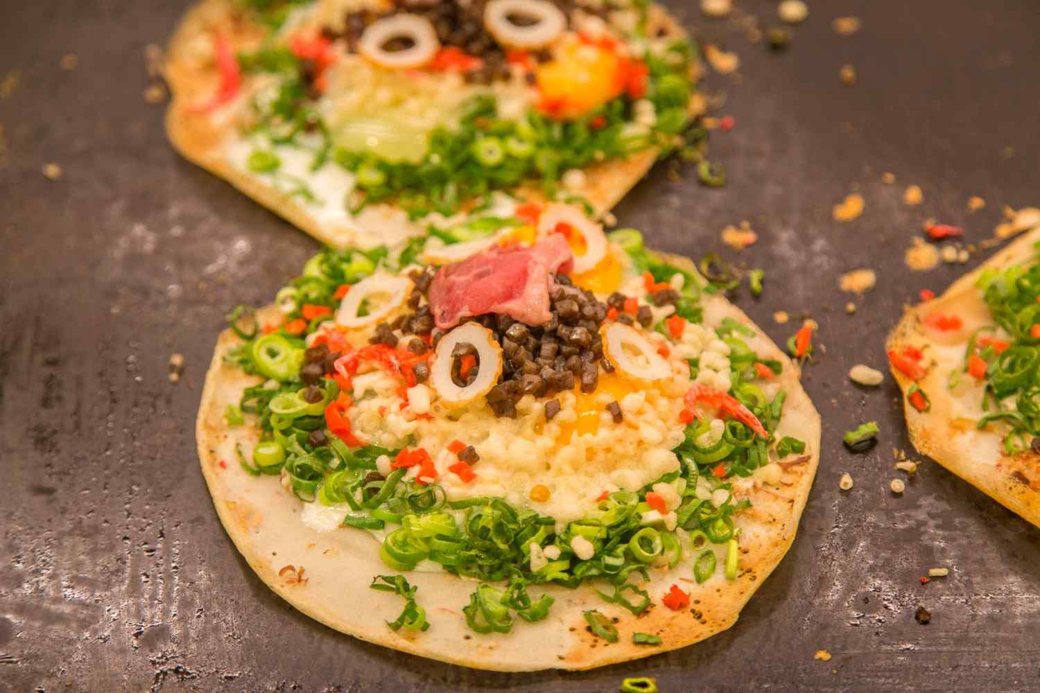 Flatbread with beans, salsa, shredded chicken, cheese, corn, tomatoes, cilantro and scallions with a balsamic drizzle.