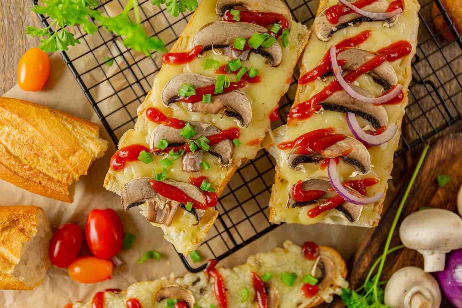 A Flatbread with olive oil, thin sliced steak, sautéed onions and peppers, grape tomatoes, shredded lettuce, mozzarella cheese, oregano, salt and pepper with balsamic drizzle.