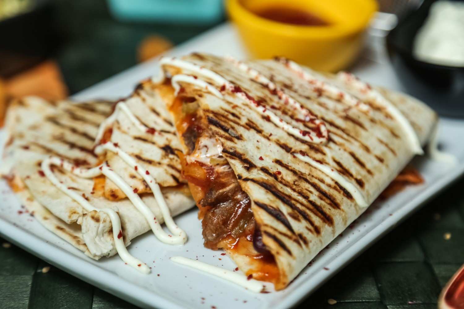 Nutella, marshmallows, and graham crackers in a grilled tortilla.